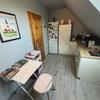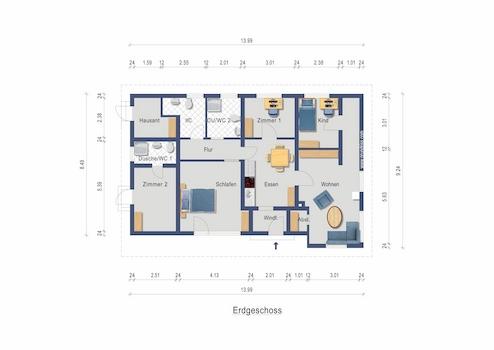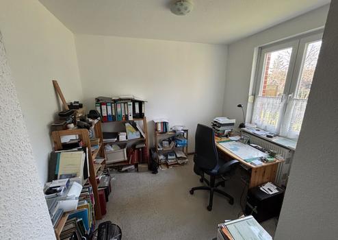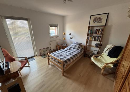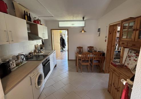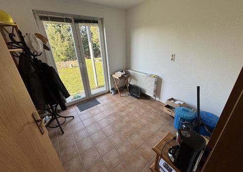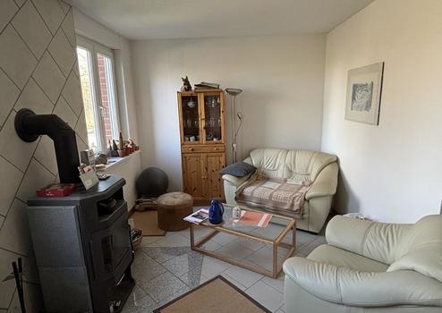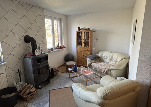 Die Wohnung im Erdgeschoss verfügt über eine Wohnküche, Wohnzimmer mit Kaminofen, zwei Schlafzimmer, Büro, WC und Duschbad.