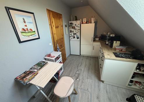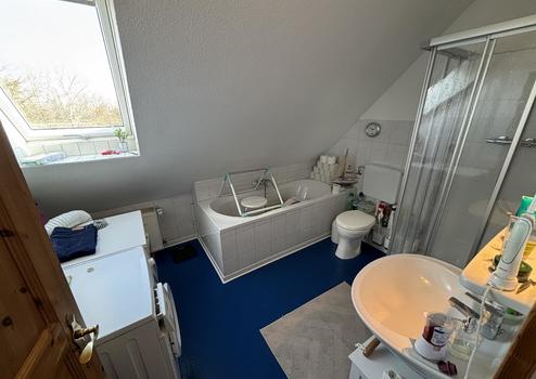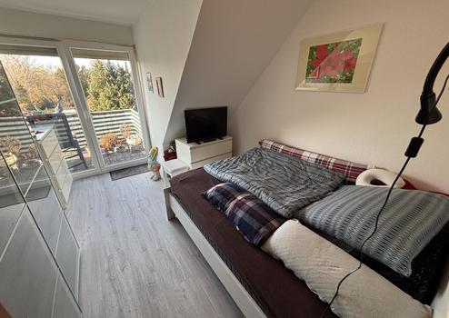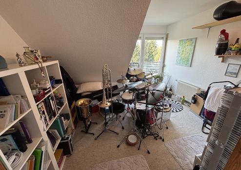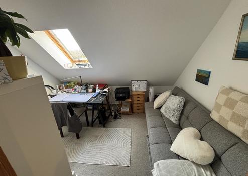 Die Dachgeschosswohnung verfügt über einen eigenen Balkon, von dem aus Sie den Blick ins Grüne genießen können. Auch hier sorgt eine kluge Raumaufteilung für Gemütlichkeit und Flexibilität. Großer Wohnbereich mit Kaminofen, 2 Schlafzimmer, Büro, Küche, Vollbad, Gäste-WC und Abstellraum.