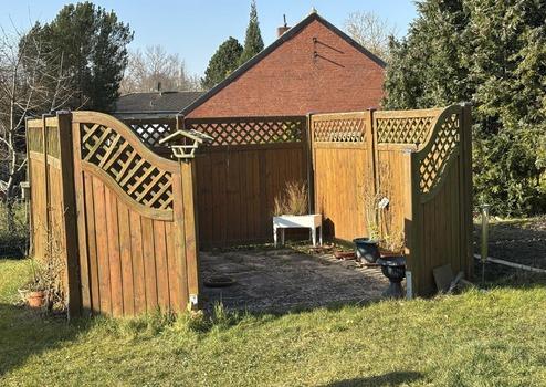 Beide Wohnungen sind über separate Eingänge zugänglich. Der große Garten verfügt über ein Gartenhaus und eine Grillecke, die derzeit von beiden Einheiten genutzt werden.