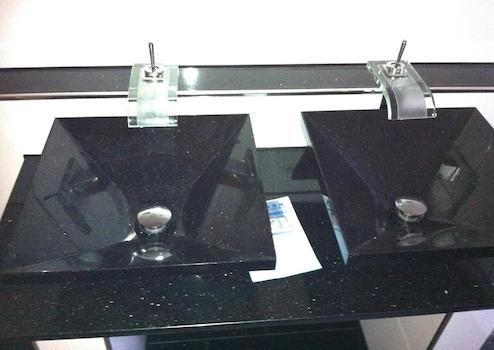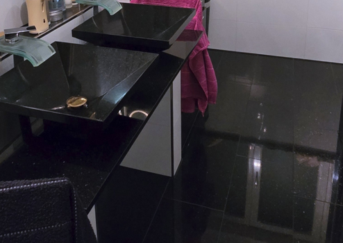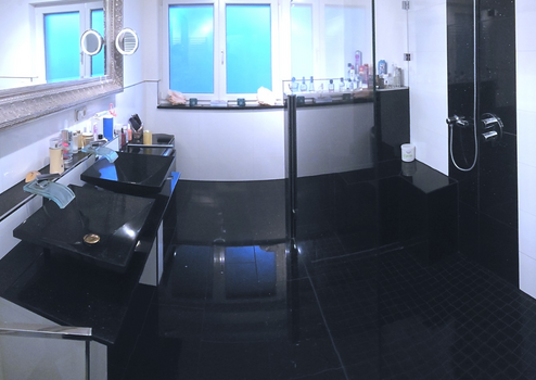 Küche und Vorratsraum, Wände und Böden mit Star Galaxy Granit gefliest, großes Bad mit Star Galaxy gefliest, Trapezwaschbecken aus Star Galaxy Granit. Wände im Bad mit weißen Hochglanzfliesen ausgestattet. Metallschienen als Abschlüsse / Kanten, große begehbare Dusche mit Grohe Unterputz Armaturen, sowie Rainshowerdusche und Handbrause von Grohe.