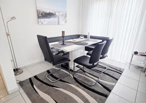 Das geräumige Wohnzimmer im Erdgeschoss mit Kamin und Platz für einen Esstisch bietet genügend Raum für gemütliche Stunden mit Familie oder Freunden. In der kalten Jahreszeit lassen Sie den Kaminofen für eine wohlige Wärme brennen. Von hier aus gehen Sie auch direkt auf die Terrasse, die mit einer Hecke Ihre Privatsphäre sichert.