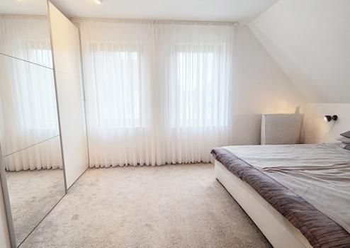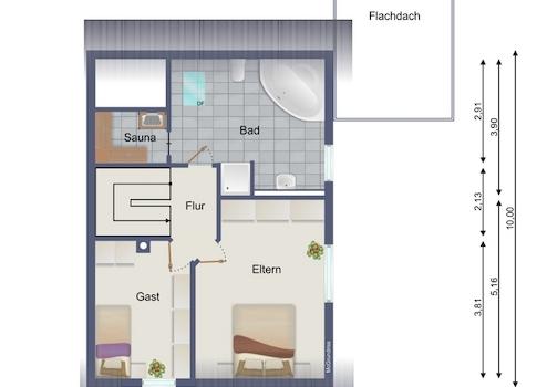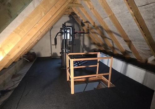 Ein weiteres Highlights des Hauses ist sicherlich das großzügige Badezimmer im Obergeschoss mit Sauna, Dusche und Badewanne. Zwei Schlafzimmer runden die Aufteilung ab. Eine Ausziehtreppe ebnet den Weg ins Dachgeschoss. Wenn man dieses dämmt, besteht hier sicherlich noch weiterer zu nutzender Platz.