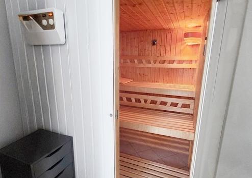 * Badezimmer mit Wanne, Dusche und Sauna