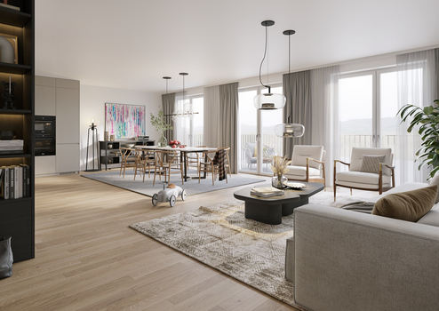 Die Ausstattung der Wohnungen lässt keine Wünsche offen. Hochwertige Materialien und eine durchdachte Gestaltung schaffen ein elegantes und komfortables Wohnambiente. Die offenen Wohn- und Essbereiche bieten viel Platz für Individualität und geselliges Beisammensein.