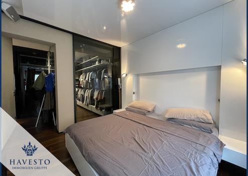 Im Schlafzimmer befinden sich maßgefertigte Einbauschränke mit Glaselementen, die für eine klare, aufgeräumte Atmosphäre sorgen. Auch das angrenzende Ankleidezimmer ist mit passenden Einbauschränken ausgestattet, die viel Platz für Kleidung und Accessoires bieten und den hochwertigen Gesamteindruck der Wohnung abrunden.