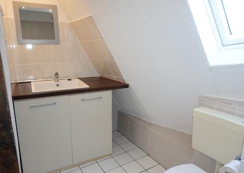 Die Hauptwohnung verfügt über einen separaten seitlichen Zugang. Von der Diele mit praktischen Anschlüssen für Waschmaschine und Trockner führt eine Treppe sowohl in die Wohnräume im Ober-/ Dachgeschos als auch in den Keller.