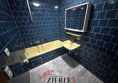 - Das Badezimmer ist raumhoch gefliest und mit einer Badewanne mit integrierter Dusche, einem Waschbecken und einem Waschmaschinenanschluss ausgestattet.