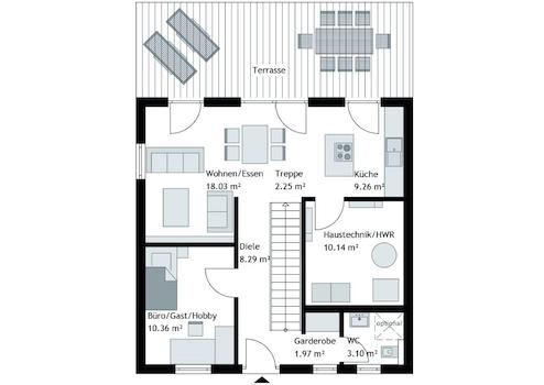 Die Grundrisse zeigen Beispiele und sollen Ihnen einen ersten Eindruck unserer Häuser bieten. Wie Ihr Haus später aussieht, entscheiden Sie selbst: vom Grundriss über die Ausstattung bis hin zur Frage, ob und welche Arbeiten Sie selbst übernehmen möchten.