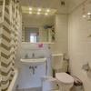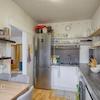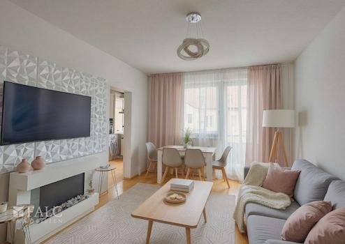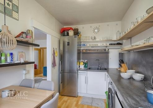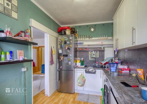 Ebenfalls auf der rechten Seite befindet sich das Wohnzimmer mit Zugang zu einer kleinen Loggia. Eine Schiebetür verbindet den Wohnbereich mit der Küche, die mit einer gepflegten Einbauküche ausgestattet ist.