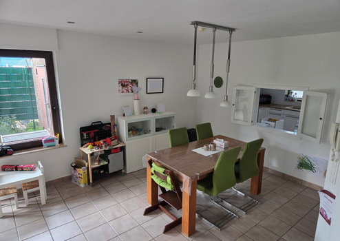 Vom Flur aus gelangen Sie in den großzügigen Wohn- und Essbereich, der mit großen Fensterflächen, einem harmonischen Grundriss und dem direkten Zugang zur überdachten Sonnenterrasse sowie dem Garten überzeugt – ideal für gesellige Abende, erholsame Stunden im Freien oder unbeschwertes Spielen der Kinder.