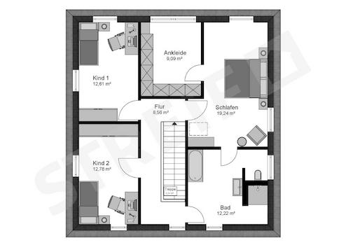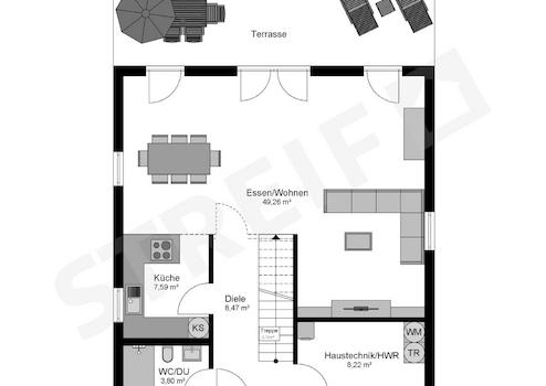 Die gezeigten Fotos und Grundrisse ist ein Hausbeispiel welches in der realen Umgebung abgebildet wird, und so umgesetzt werden kann. Jedes STREIF-Haus wird individuell nach Kundenwunsch geplant und gebaut.