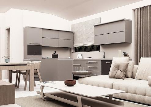 Rechts von der Diele gelangen Sie in den offen gestalteten Wohn-/ Essbereich mit integrierter Küche. Von hier erreichen Sie die atemberaubende Dachterrasse, inklusive Blick auf die Weinberge und die umliegende Natur.