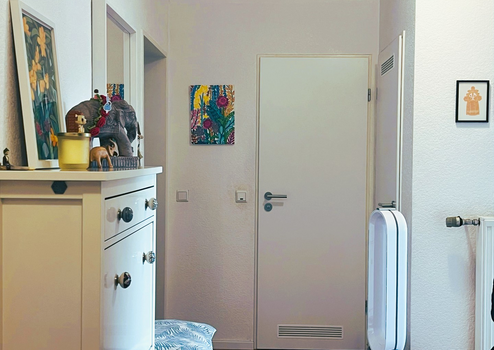 Die Wohnung besticht durch ihre helle, offene Raumgestaltung: Ein großer Raum vereint die maßgefertigte Einbauküche, den großzügigen Essbereich und das wohnliche Wohnzimmer – perfekt für geselliges Beisammensein und modernes Wohnen. Zusätzlich stehen ein großes Schlafzimmer und ein flexibel nutzbares Kinder-/Arbeitszimmer zur Verfügung.