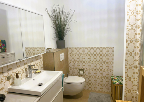 Bodenbeläge: hochwertiges Laminat in allen Wohnräumen; das Badezimmer wurde kürzlich teilsaniert und mit neuen modernen Bodenfliesen ausgestattet.