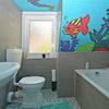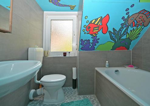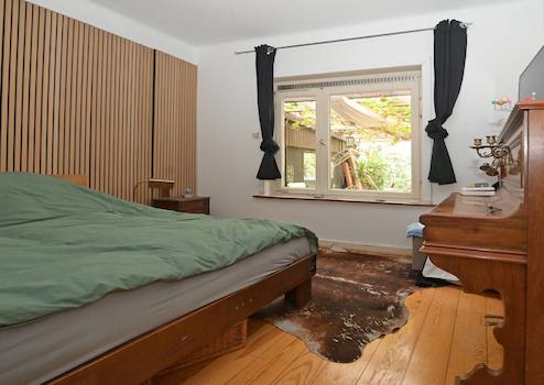 Im Obergeschoss gibt es ein großes Schlafzimmer mit Ankleide und ein Badezimmer mit Wanne.