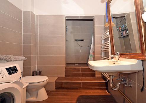 Im Erdgeschoss befinden sich ein großzügiger Wohn-/Essbereich, ein Schlafzimmer, die tolle Retro-Küche mit anliegendem Wintergarten, ein Badezimmer mit Dusche und der Zugang zum Garten.