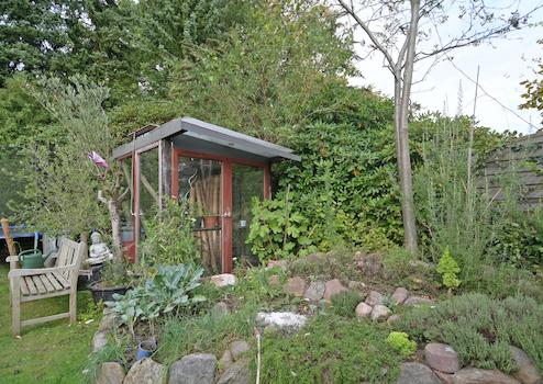 Der wunderschön eingefriedete Garten von über 500 m² bietet neben einer Doppelgarage noch ein schönes Gartenhaus und eine großzügige, überdachte Terrasse.