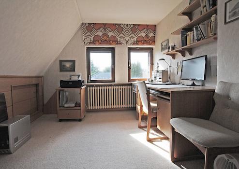Im Wintergarten mit Fußbodenheizung ermöglicht eine Schiebetür über ein paar Stufen den Zugang zum attraktiv angelegten Garten. Pflanzen und Blumen säumen Wege, Rasen und Terrasse, der üppige Bestand von Rhododendren, blühenden Stauden und Bäumen schafft ausreichend Abgrenzung zur Nachbarschaft. Eine an der Garage rückwärtig integrierte Gartenlaube bietet Raum für Gartenmöbel und allerlei Gerätschaften. Im hinteren Teil des Gartens befindet sich eine Südwest-Terrasse (ca. 35qm² mit schützender Pergola-Überdachung. In den Sommermonaten bietet sie viele Sonnenstunden, ist aber auch zu anderen Jahreszeiten sehr gut für Gartenfeste nutzbar! Der großzügige Eingangsbereich bietet Platz für eine Garderobe. Hier befindet sich das Gäste-WC sowie ein kleiner Abstellraum. Über eine Treppe wird das Obergeschoss (ca. 37m²) erreicht, mit zwei weiteren Zimmern und einem hellen Bad. Am rückwärtigen Schlafzimmer (ca. 15m²) gibt es einen Balkon, der den Garten überblicken lässt. Eine Leitertreppe führt zum beheizbaren Spitzboden. Der Keller (ca. 50m²) beherbergt diverse Räume. Ein Wasseranschluss für die Hauswirtschaft, eine Werkstatt und ein Hobbykeller bieten viele Nutzungsmöglichkeiten. Ein wohnlicher Raum (ehemals der "Partykeller") verfügt zudem über einen Kamin, sowie einen kleinen Bürobereich. Folgende Instandhaltungs-Maßnahmen sind zuletzt durchgeführt worden: Die Öl-Heizung von 2001 hat 2023 einen neuen Brenner erhalten. Ein neuer Öltank wurde zuvor in 2010 installiert. Das Glasdach des Wintergartens erhielt im Jahr 2021 eine elektrische Markise mit Windsensorik. Die Elektrik des Garagen-Tores inklusive Fernbedienung wurde erst 2024 erneuert. 2006 wurden an sämtlichen Fenstern elektrische Außenrolläden angebracht. Eine Dachreinigung und -versiegelung sowie eine Schornsteinverkleidung erfolgte im Jahr 2000.