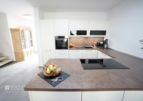 Beim Betreten dieses modernen Hauses, das 2021 erbaut wurde, werden Sie von einem einladenden Eingangsbereich empfangen. Die Diele führt direkt in das großzügige Wohn- und Esszimmer, das mit 44,14 m² viel Platz für Familienaktivitäten bietet. Große Fenster sorgen für viel Tageslicht und bieten einen schönen Blick auf die Terrasse und den Garten. Die offene Küche ist modern ausgestattet und lädt zum gemeinsamen Kochen ein.