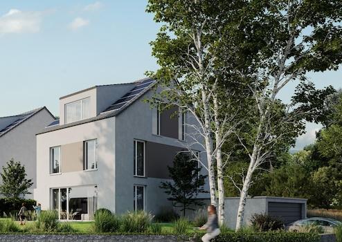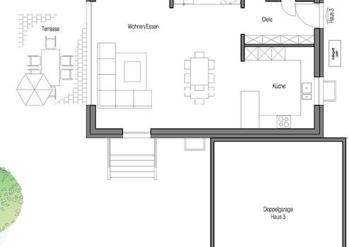 Insgesamt entstehen auf einem 1022m² großem Grundstück drei freistehende Einfamilienhäuser, wovon Haus 1 bereits verkauft und erstellt wurde.
