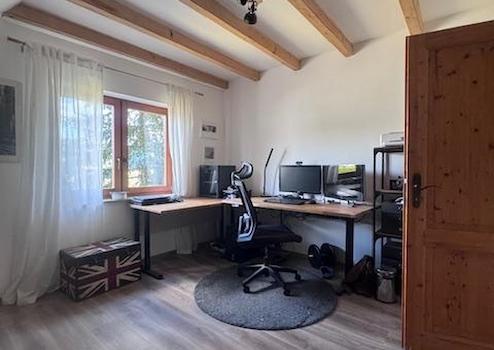 Die separate Küche mit angrenzendem Abstellraum ist hell und bietet ausreichend Platz. Im unteren Bereich befinden noch das Schlafzimmer – mit Zugang zum zweiten Balkon – sowie ein weiteres Zimmer das aktuell als Büro genutzt wird. Ein Badezimmer mit Eckbadewanne und Dusche sowie ein separates Gäste-WC ergänzen das Raumangebot.