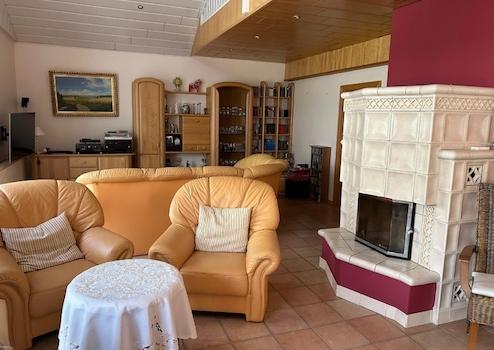 Über 70 m² Wohn-/Essbereich mit Kachelofen und direktem Zugang zum Wintergarten