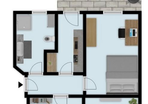 Beim Betreten der Wohnung werden Sie von einer langen Diele empfangen, welche Ihnen Platz für eine kleine Garderobe bietet. Zu Ihrer rechten gelangen Sie in das gemütliche Wohnzimmer mit angrenzendem Kinder- oder Arbeitszimmer. Geradeaus finden Sie das großzügige Schlafzimmer mit Blick auf die eigene Terrasse. Links liegen das Tageslichtbad sowie die Küche. In der Küche steht Ihnen eine moderne Einbauküche zur Verfügung. Außerdem gelangen Sie von hier aus auf Ihre eigene Terrasse mit südwestlicher Ausrichtung, wo sich ruhige Stunden in der Sonne verbringen lassen.