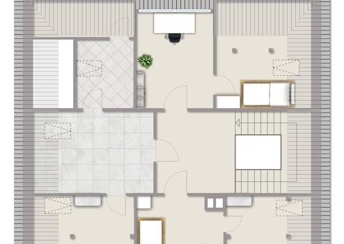 Dachgeschoss: Flur, drei Zimmer, zwei Abstellräume, zwei Räume in Wohnqualität ausgebaut