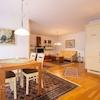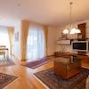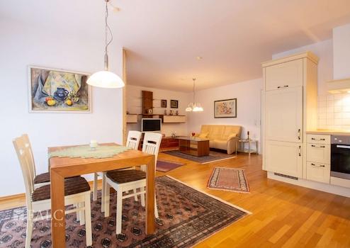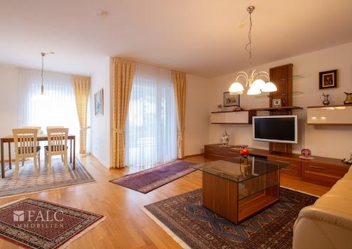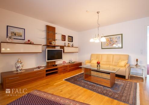 Die Wohnräume sind mit Fliesen und mit Echtholz-Parkett belegt.