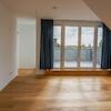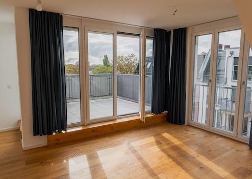 Über die Treppe geht es in die 5. Etage. Dort befindet sich ein großzügiges Wohn- & Arbeitszimmer, sowie eine separate Gästetoilette. Vom Wohnzimmer geht es über die Terrassentür auf die großzügige 17m² Dachterrasse, die eine Ost/Süd- Ausrichtung hat und einem weiten Blick über die anliegenden Häuser bietet. Der Grundriss ist zweckmäßig, zeitgemäß und modern ausgeführt. Ab Oktober 2025 kann die ansprechende und vollständig neu renovierte Wohnung genutzt werden.
