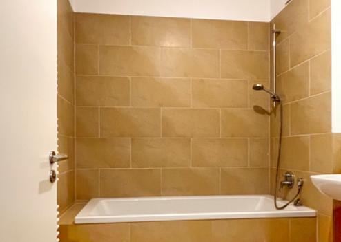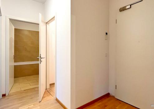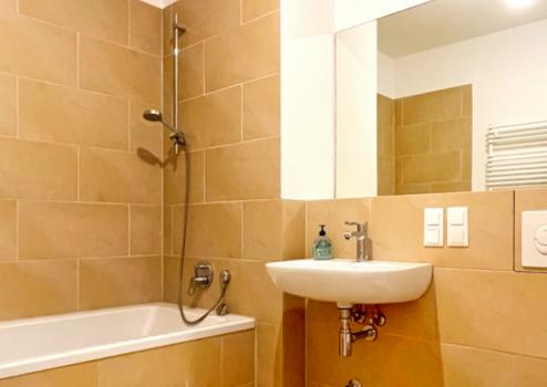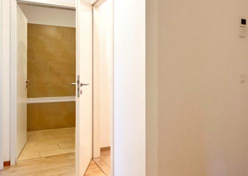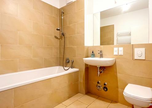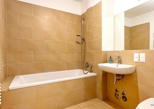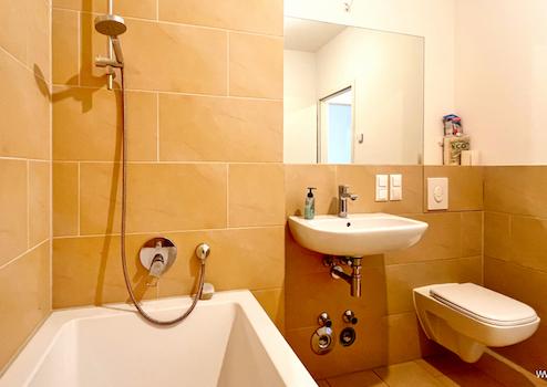 Ein Hauswirtschaftsraum mit Waschmaschinenanschluss, ein modernes Bad mit Wanne, Waschbecken und WC, sowie Fußbodenheizung, Aufzug und Kellerraum unterstreichen den hohen Wohnkomfort.