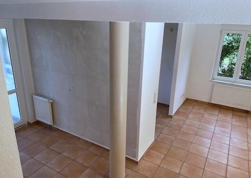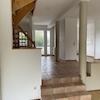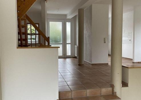 Die Diele geht fließend in den Essbereich mit halboffener Küche über. Zwei elegante Rundsäulen, eine multifunktionale Trennwand (auch als Sitzbank nutzbar) sowie drei versetzte Treppenstufen zum Wohnzimmer schaffen ein architektonisch reizvolles Raumgefühl mit viel Tiefe und Struktur.