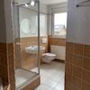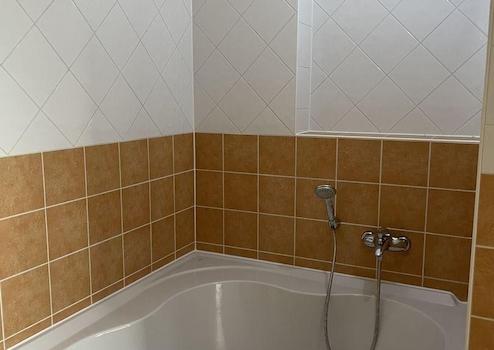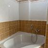 Im 1. Obergeschoss befinden sich zwei Schlafzimmer – jeweils mit Fensterzugang zur Balkonloggia – sowie ein Badezimmer mit Eckbadewanne und Dusche, gestaltet in mediterranen Farbtönen.