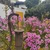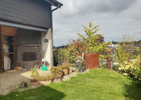 Der sonnige Garten mit Terrasse lädt zum Entspannen ein - ein Ort, an dem man die Ruhe und die grüne Umgebung genießen kann.