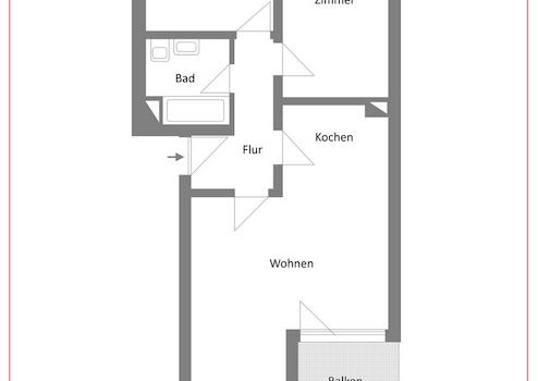 Diele mit Platz für Garderobe, innenliegendes, hell gefliestes Badezimmer mit Lüftung, offene Küche mit Wohn-/Essbereich und Zugang zum Balkon, Schlafzimmer und Kinder-/Arbeitszimmer.
