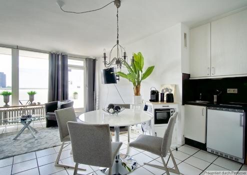 Das Apartment ist mit einem hochwertigen Boxspringbett 1,20 x 2,00 Meter Größe und einem Kleiderschrank ausgestattet. Die Pantryküche verfügt über zwei Kochplatten, einen Kühlschrank und eine Mikrowelle mit Grill- und Backfunktion, weiterhin eine Kapsel-Kaffeemaschine, Wasserkocher, Toaster.