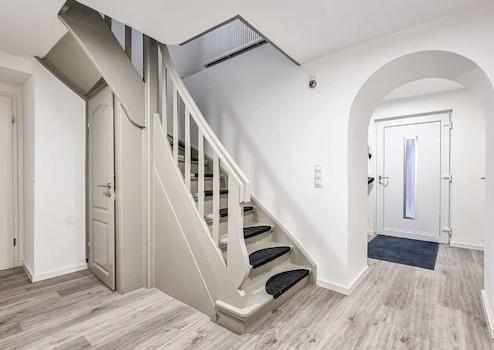 Obergeschoss: Über die restaurierte, vom Flur abgehende Holztreppe erreicht man das Obergeschoss. Hier befinden sich ein Kinderzimmer/Wohnzimmer, ein Schlafzimmer mit angrenzendem Tageslichtbad mit großer Walk-In Dusche und ein Arbeitszimmer. Zusätzlich birgt diese Etage ein weiteres Badezimmer mit Badewanne. Eine Küche mit Einbauküche ist auch auf dieser Etage vorhanden und kann bei Bedarf als zusätzlicher Wohnraum genutzt werden. Weiterhin sorgt eine Klimaanlage auf dieser Etage für eine angenehme Kühle in den Sommermonaten.