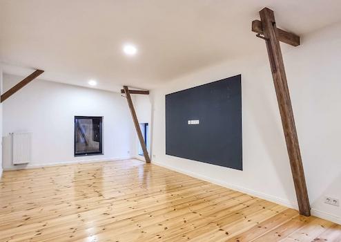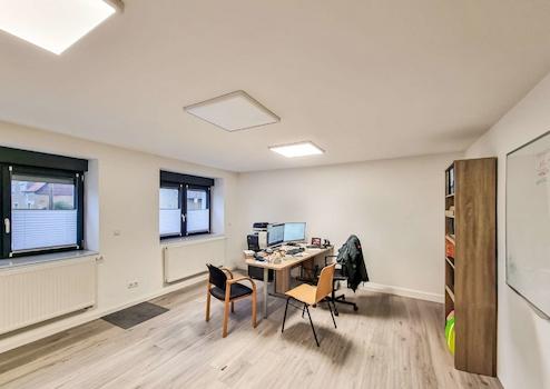 Der Wohnbereich des in den 1930er Jahren erbauten Nebengebäudes, wurde in solider Ziegelbauweise errichtet und ebenfalls saniert. Im Obergeschoss befindet sich ein großer Wohnraum mit aufgearbeitetem Sichtgebälk und Holzdielung. Eine kompakte Küche mit Einbauküche sowie ein Badezimmer mit Dusche finden sich hier ebenfalls wieder. Diese Räumlichkeiten eignen sich hervorragend als Einliegerwohnung, für erwachsene Familienmitglieder oder als Büro. Das Nebengebäude verfügt über einen separaten Stromzähler, was eine unabhängige Nutzung ermöglicht. Die Elektrik der Wohnbereiche und die Wasserleitungen wurden hier ebenfalls erneuert. Eine Klimaanlage ist vorhanden.