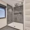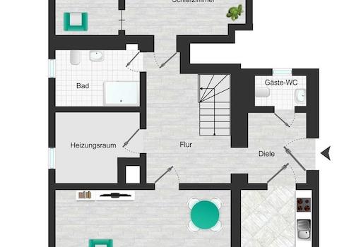 Erdgeschoss: Das Erdgeschoss bietet einen großen Wohnbereich mit angrenzender funktional gestalteter Küche. Eine Einbauküche ist bereits vorhanden. Neben einem zentral gelegenen Flur stehen ein Schlafzimmer und ein angrenzendes Arbeitszimmer zur Verfügung. Das Tageslichtbad ist hochwertig gefliest und mit einer übergroßen Dusche ausgestattet. Im Eingangsbereich befindet sich zusätzlich ein Gäste-WC. Der Heizungsraum sorgt für die effiziente Unterbringung der modernen Haustechnik. Eine Abstellkammer ist vorhanden.