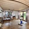 Das geräumige Wohnzimmer ist in zwei Bereiche mit einem großen Durchbruch geteilt, von hier kommen sie auch in den Garten.