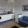 Von der Diele aus betritt man links den Wohnraum mit Sitzbereich, einer kleinen Essecke und dem gut ausgestatteten, integrierten Kochbereich.