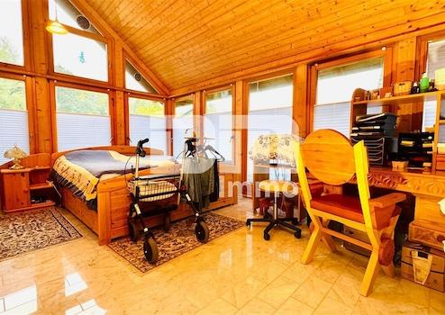 Highlight des EG ist der lichtdurchflutete Wintergarten mit Marmorfliesen und Fußbodenheizung (aktuell Schlafzimmer), von dem Sie ebenfalls auf die teilüberdachte Gartenterrasse gelangen.
