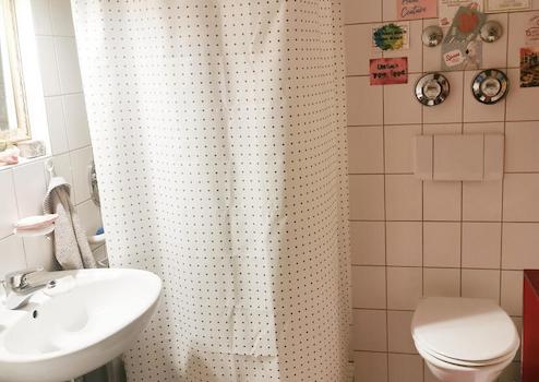 * helles Badezimmer mit Dusche, WC und Handwaschbecken