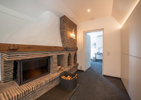 •Mit hitzebeständigem Glas verkleideter Kamin im DG