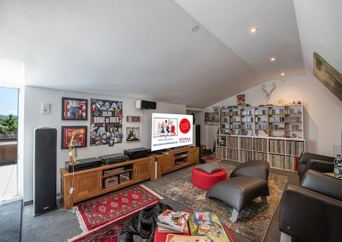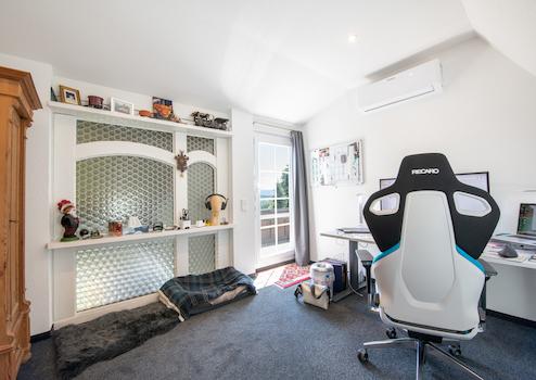 Panoramabüro / Panoramakinderzimmer: Dieser lichtdurchflutete Raum im Dachgeschoss bietet einen ruhigen Rückzugsort mit viel Tageslicht. Die charmante Dachschräge und der warme Bodenbelag verleihen dem Raum eine wohnliche Atmosphäre. Ideal als Homeoffice, Kinderzimmer oder als kreativer Arbeitsbereich. Kaminzimmer: Ein echtes Highlight: das gemütliche Kaminzimmer mit sichtbaren Holzbalken und stilvoller Möblierung. Der Kamin sorgt für eine behagliche Stimmung – perfekt für entspannte Abende oder als Bibliothek. Büro / Kinderzimmer west inkl. Balkon und weiterem Hobbyraum: Klein aber fein – dieser ebenfalls klimatisierte Raum mit viel Licht und eigenem Balkon für die gepflegte Pause im Rahmen des Homeoffice oder als top Kinderzimmer inklusive angrenzendem Hobbyraum für angehende Schlagzeuger, etc.. Badezimmer: Hell & freundlich präsentiert sich auch das Badezimmer mit Waschtisch, Toilette und als besonderes Highlight - mit komfortabler Sitzbadewanne