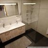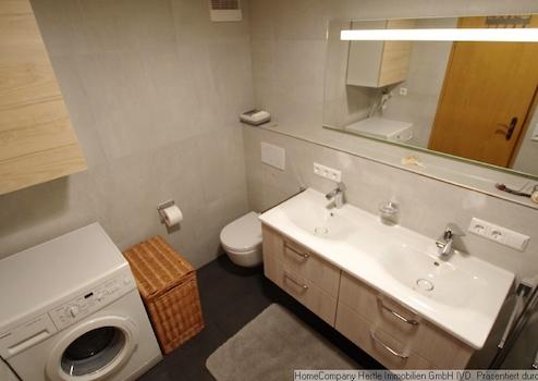 Doppelwaschbecken mit beleuchtetem Wandspiegel, Badevorleger, Waschmaschine, Wäschekorb, Handtücher