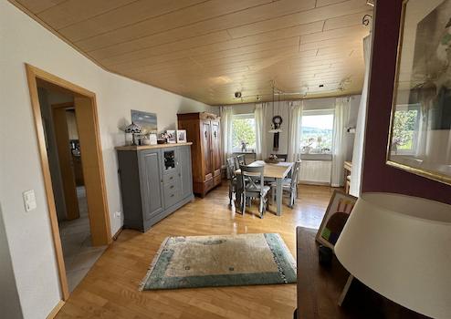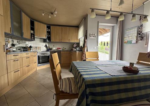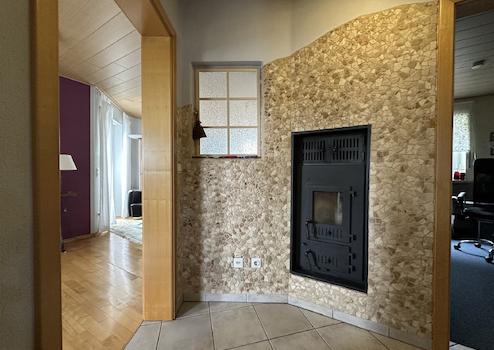 Im Erdgeschoss erwartet Sie ein großzügiges Wohn- und Esszimmer mit zwei Zugängen zur sonnigen Südterrasse ideal für entspannte Stunden im Freien. Die angrenzende, gemütliche Küche bietet nicht nur Platz zum Kochen, sondern auch eine integrierte Sitzmöglichkeit sowie direkten Zugang zu einem Balkon. Ein Kaminofen mit Zugluft sorgt an kühleren Tagen für wohlige Wärme. Zudem befindet sich auf dieser Ebene ein modernes Tageslichtbad mit bodengleicher Dusche sowie ein weiteres Zimmer, das flexibel als Büro oder Schlafzimmer genutzt werden kann.