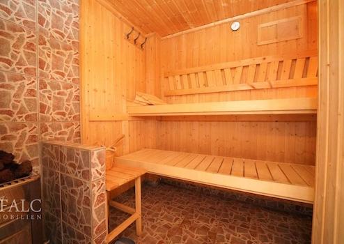 Oder Sie schwitzen erst noch eine Runde in der hauseigenen Sauna, die sich in der Verlängerung der Garage befindet. Eine besondere Atmosphäre verbreitet der Holzgeruch, mit dem die Sauna befeuert wird. Selbstverständlich wurde hier weiter gedacht und eine Dusche und ein WC verbaut.