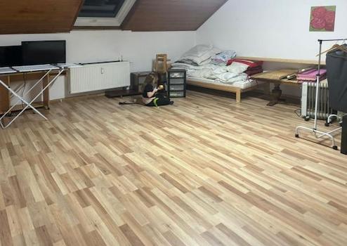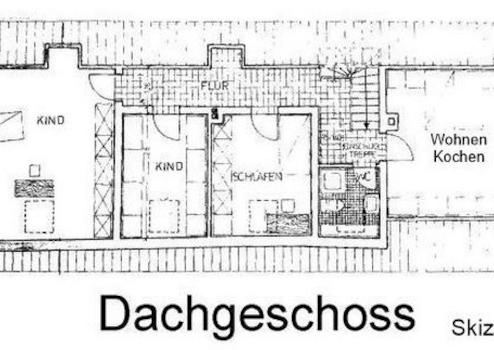 Das Dachgeschoß befindet sich eine 4-Zimmerwohnung. Über den Flur mit Gaube sind alle Räume erreichbar. Das großzügige Kinderzimmer verfügt ebenfalls über eine Gaube. Das Bad mit Wanne, Waschbecken und WC ist deckenhoch hell gefliest.