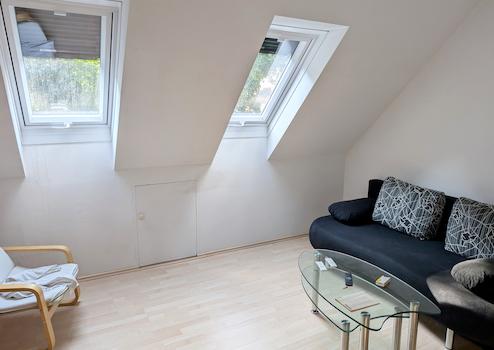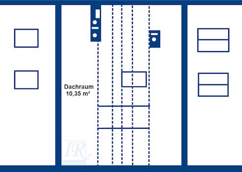 Das Dachgeschoss verfügt über ein Wohnzimmer, ein Schlafzimmer, eine geräumige Diele, ein Bad und eine Teeküche (derzeit ohne Wasseranschluss in der Teeküche). Vom Dachgeschoss gelangt man auf den Spitzboden des Hauses, wo man nochmals einen großen Stauraum hat.